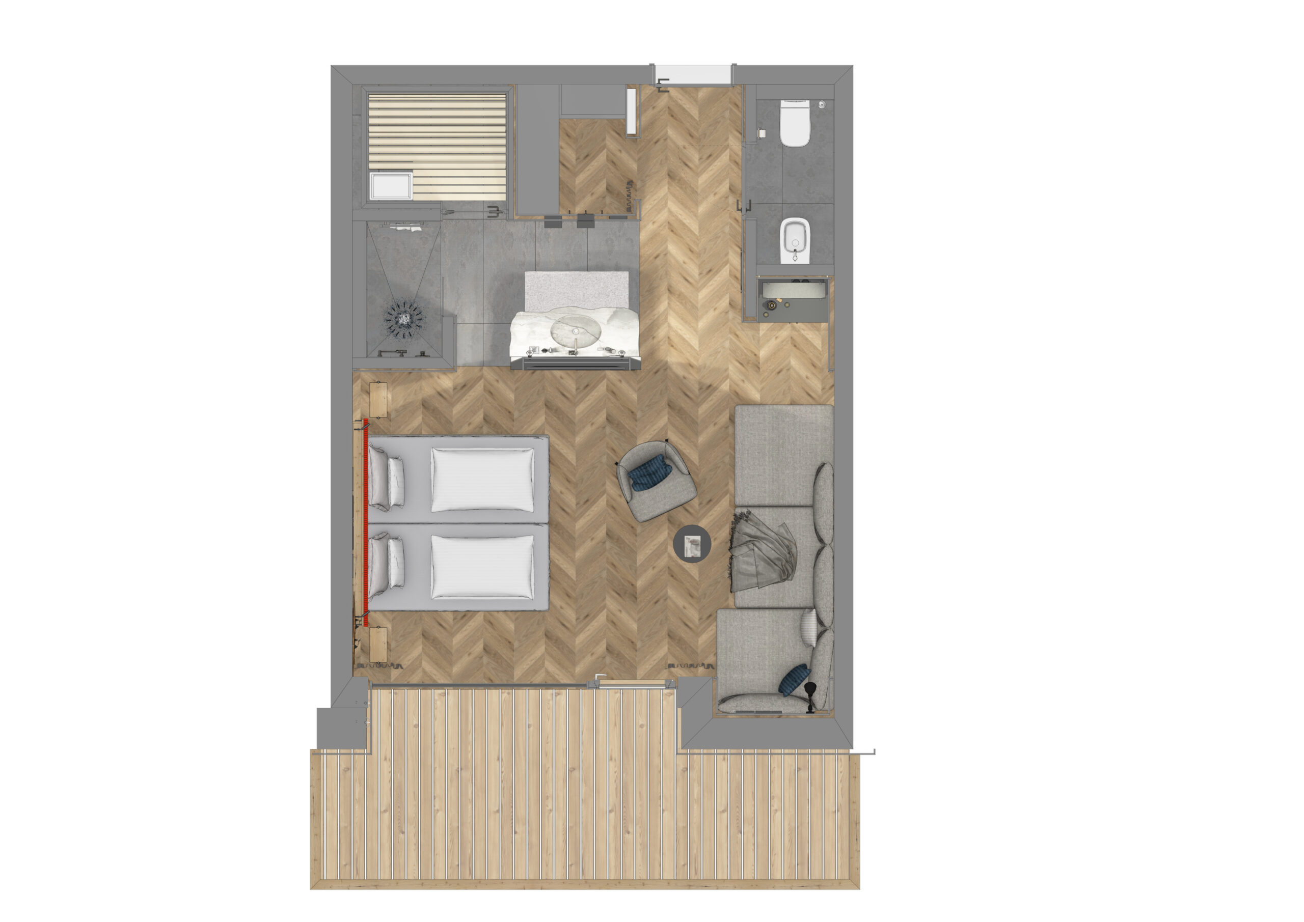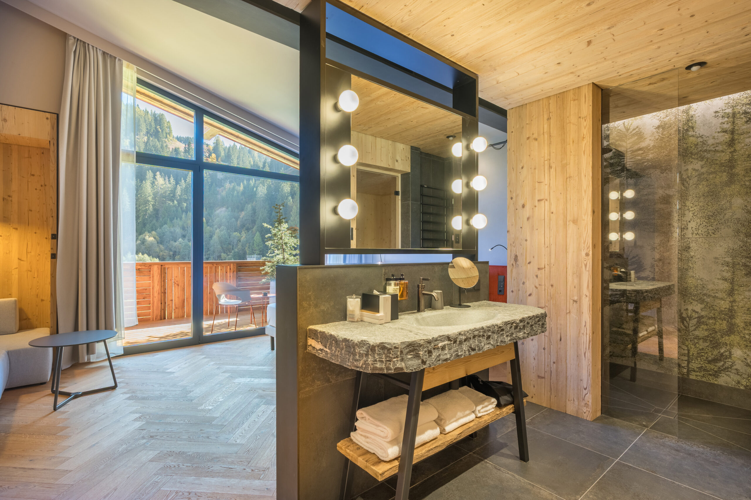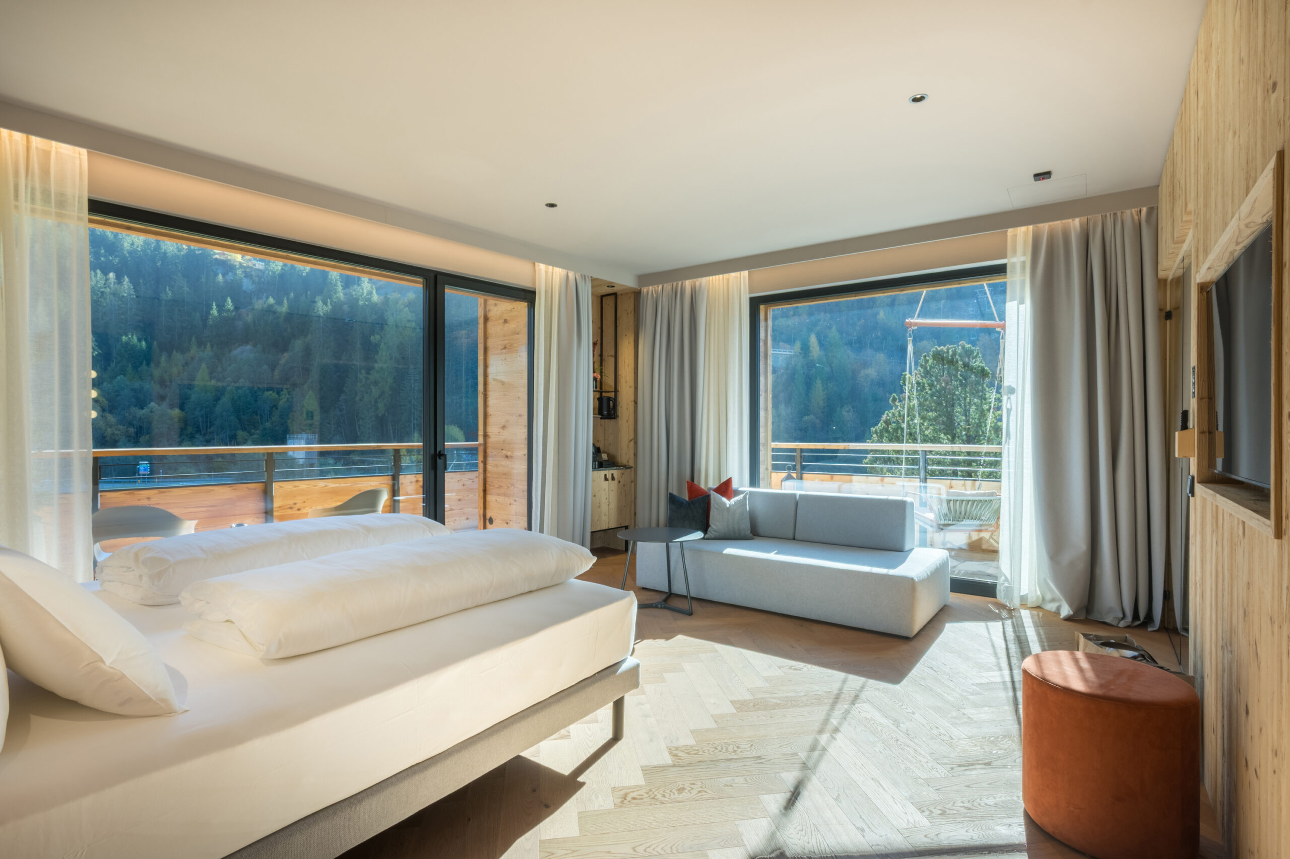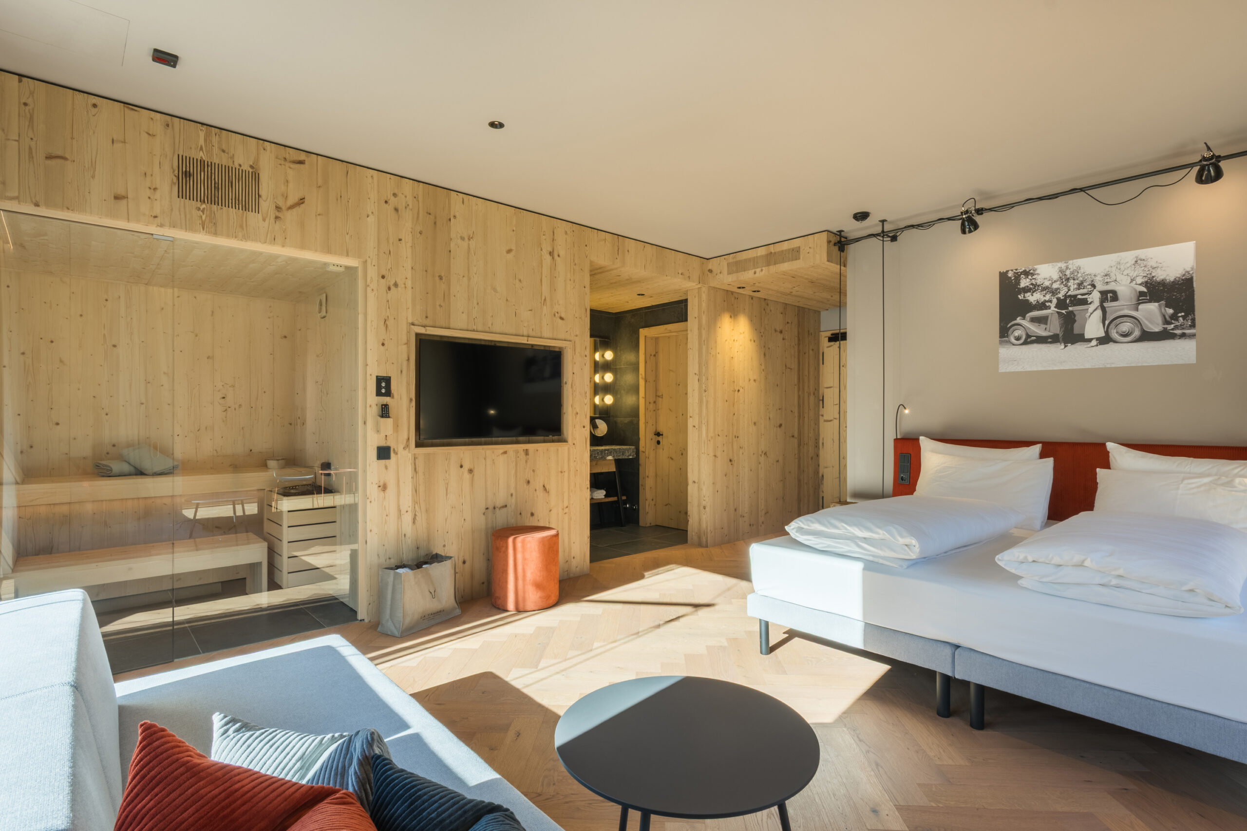 Lots of natural light, Sassolungo view, and your own space. With private sauna, walk-in closet, and furnished balcony, the Deluxe Hideaway is an elegant and bright retreat for those seeking more.