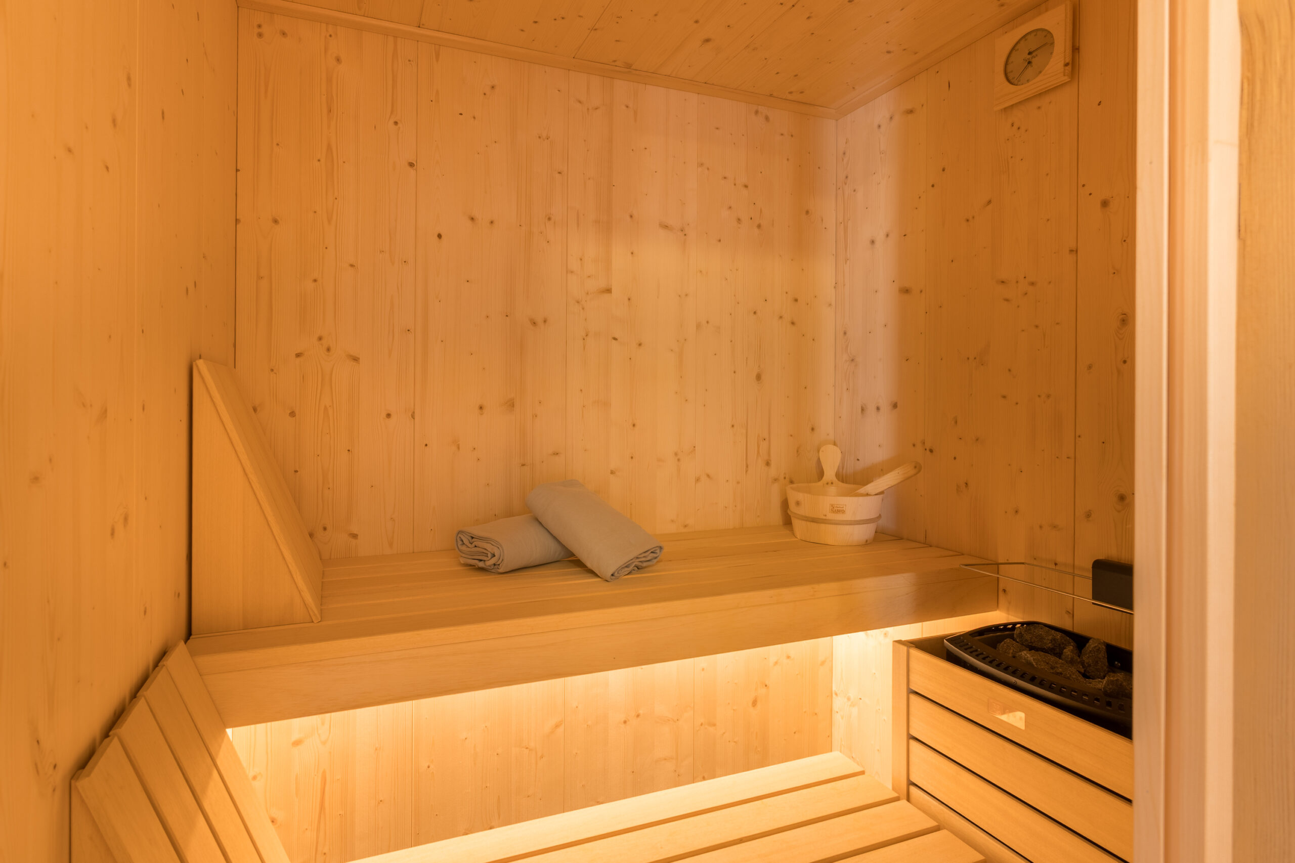 Large windows—some reaching the ceiling—frame the mountains and flood the room with light. The balcony, larger and furnished, invites outdoor relaxation. Private sauna, wooden flooring, and walk-in closet complete a space designed for those wanting more room, more light, and more panorama.